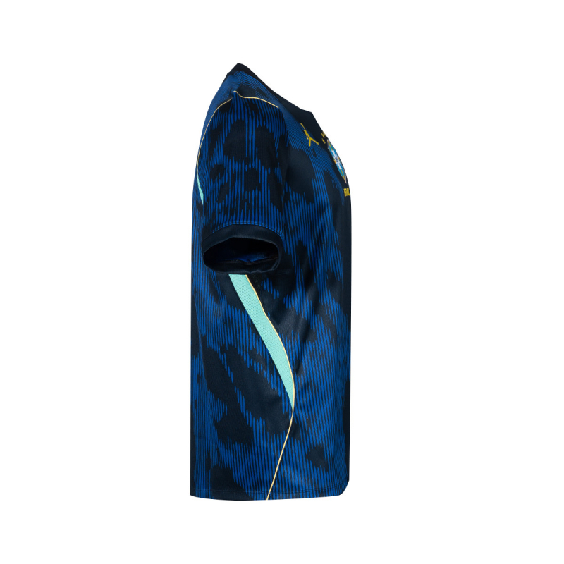Su base azul real combinada con negro transmite fuerza y carácter, mientras que los paneles laterales en tono aguamarina aportan contraste y un look atlético pensado para la velocidad y el dinamismo del fútbol moderno. El concepto visual se inspira en las brasas ardientes, representando la intensidad, la pasión y la energía que siempre han definido el juego de Brasil.